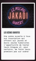 JAKADI propose simultanément des spectacles de stand up à Lausanne, du stand up à Morges, du stand up à Genève, du stand up à Yverdon, du stand up à Penthalaz et du stand up à Châtel-Saint-Denis !